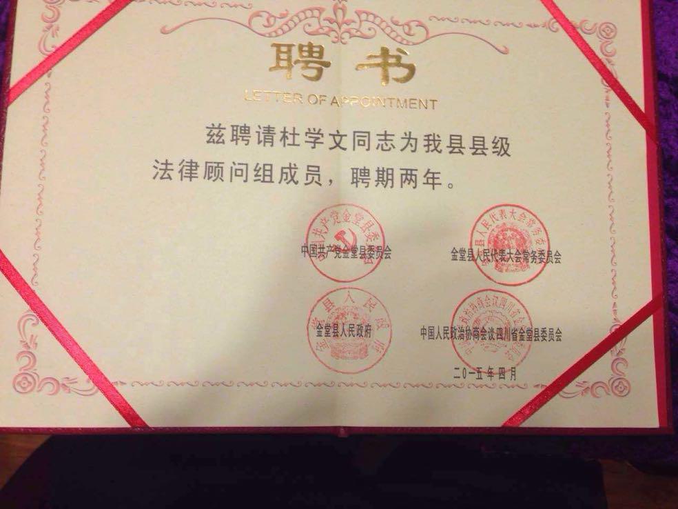 泰常律师被聘为金堂县法律顾问 2015年4月,四川泰常律师事务所优秀律师杜学文被成都市金堂县聘请为法律顾问。 政府法律顾问服务是四川泰...