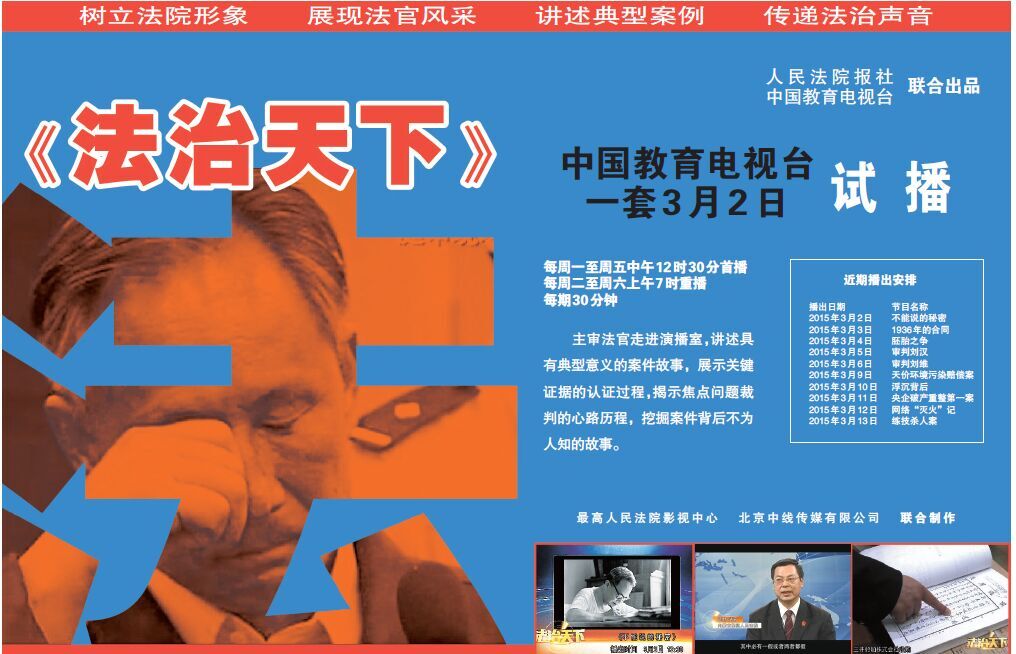 《法治天下》电视节目3月2日试播(来源:最高人民法院2015年03月02日)最高人民法院 微信号 ch_zgrmfy功能介绍 发布法院重要司法信息 ...