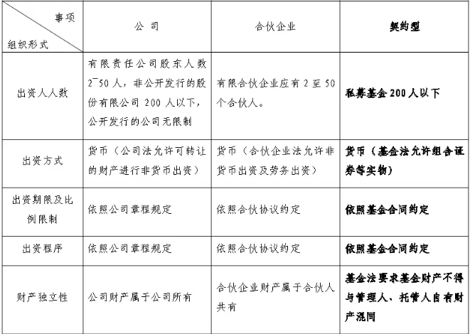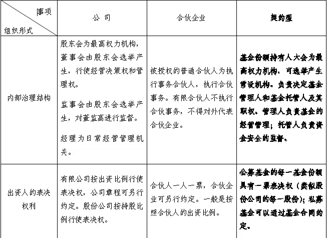 三、私募股权投资基金各组织形式比较(公司型、合伙型、契约型)